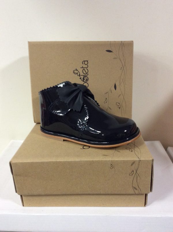 Girls Spanish Navy Patent Leather Borboleta Brand Ankle Boot With Velcro Strap And Front Bow Detail