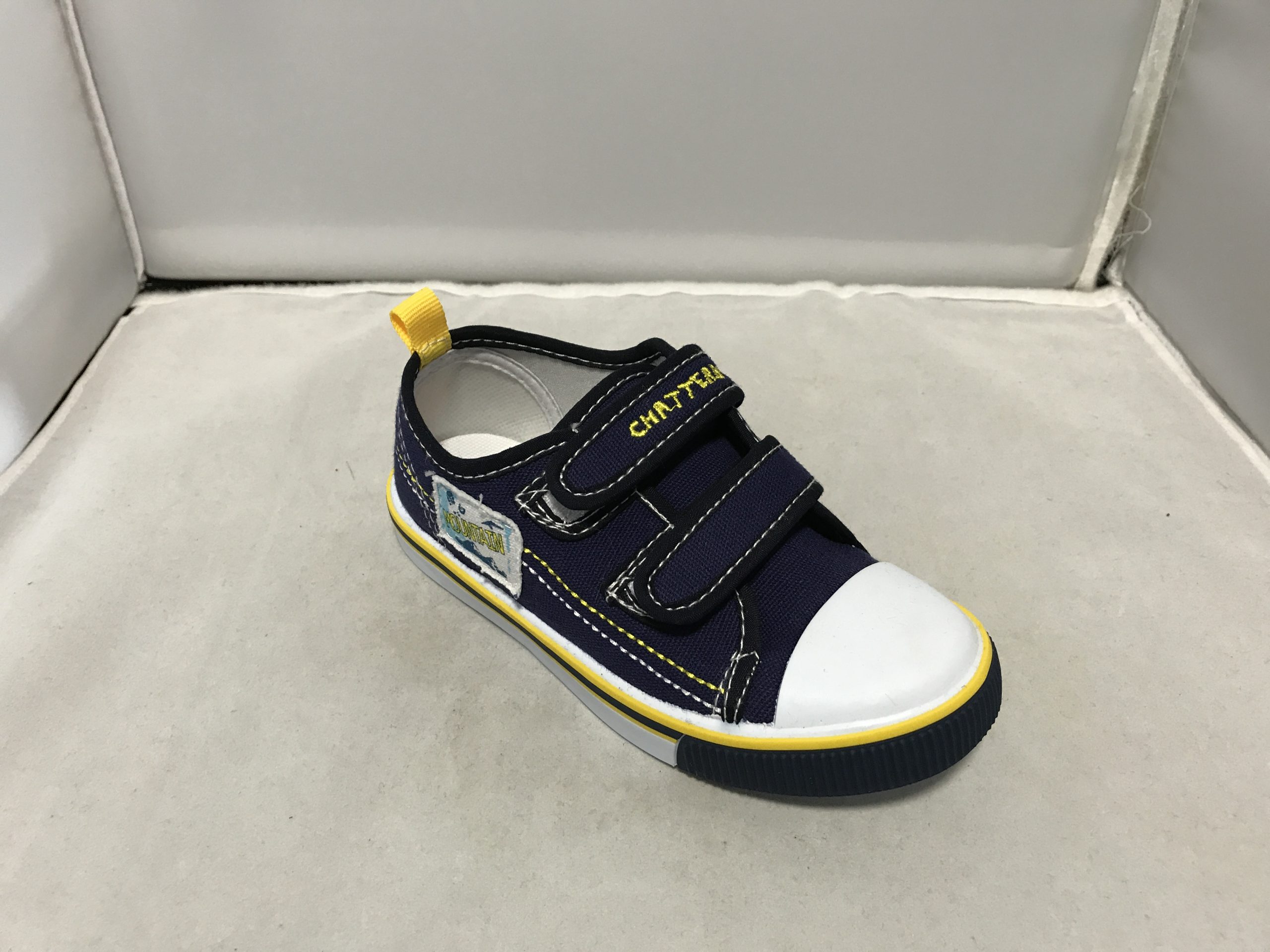 Boys Chatterbox Brand Navy Canvas Summer Pump With Double Velcro Strap And Side Pattern Detail