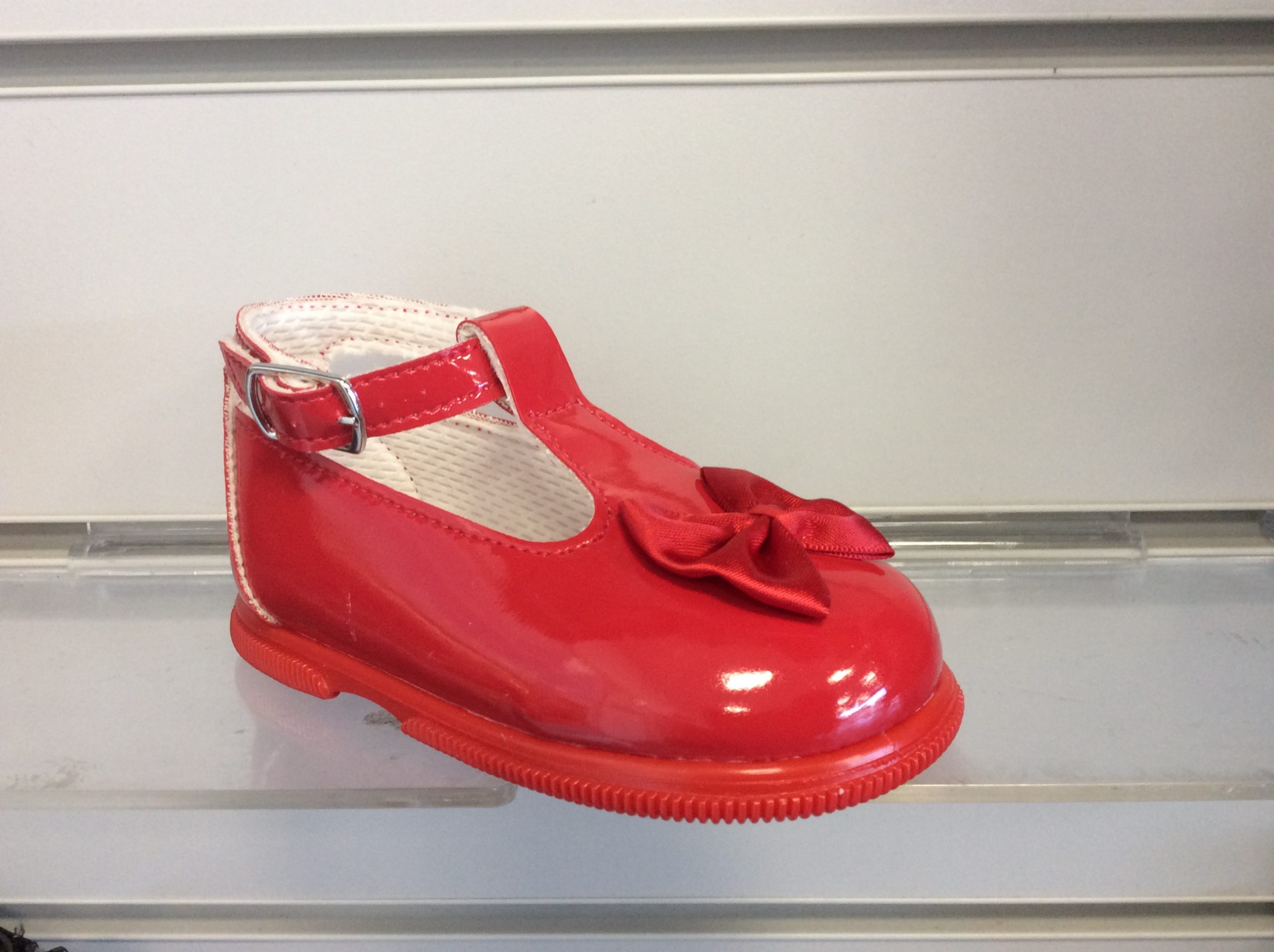 Girls Infants Red Patent T-Bar Style Shoe With Side Buckle And Satin Bow Detail