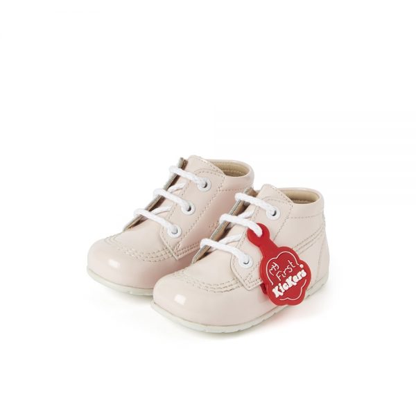 1-13112- Beautiful baby boots in perfect pink, with a contrast white sole and laces Kickers quality construction using durable, shiny patent leather